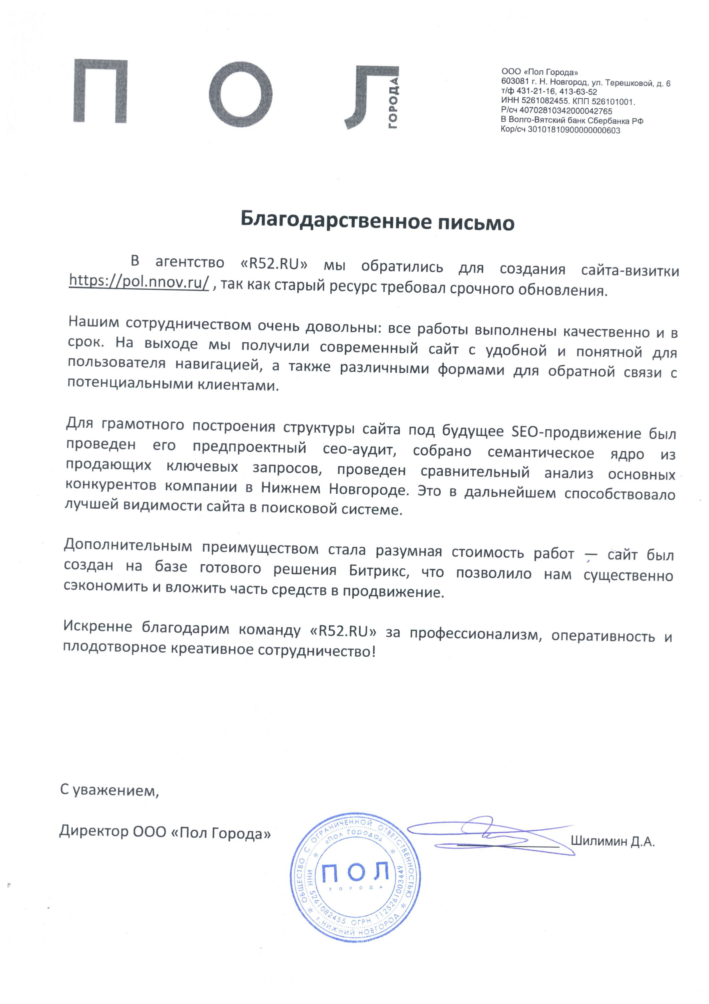 В агентство «Р52.РУ» мы обратились для создания сайта-визитки pol.nnov.ru, так как старый ресурс требовал срочного обновления.