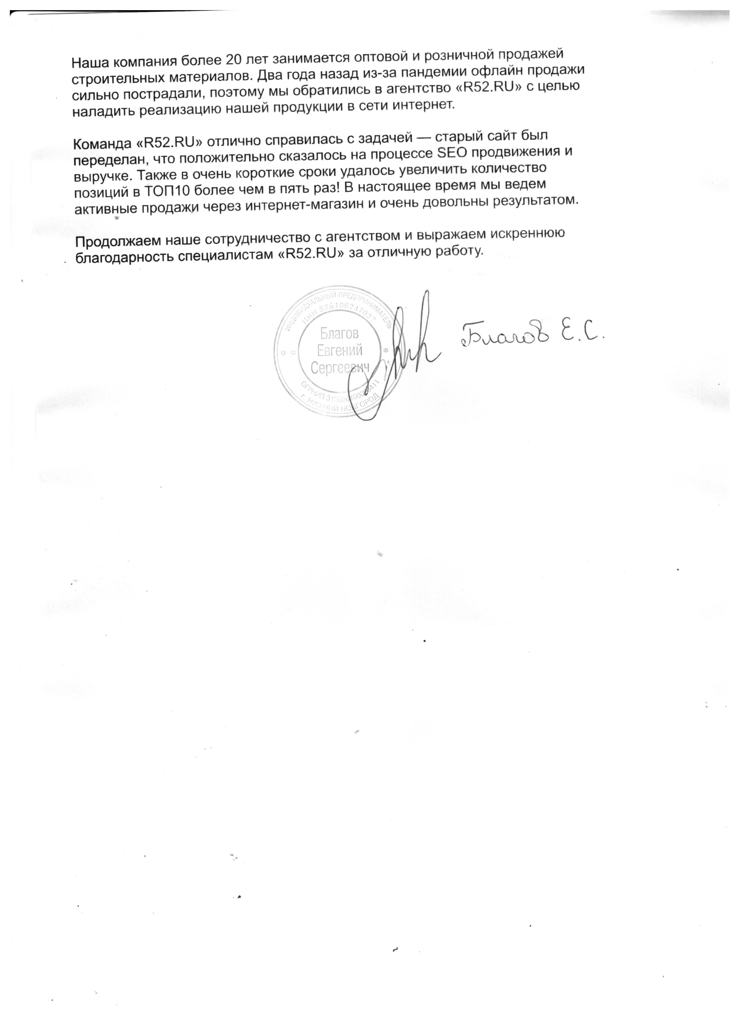 Наша компания более 20 лет занимается оптовой и розничной продажей строительных материалов. Два года назад из-за пандемии офлайн продажи сильно пострадали, поэтому мы обратились в агентство «R52.RU» с целью наладить реализацию нашей продукции в сети интернет.