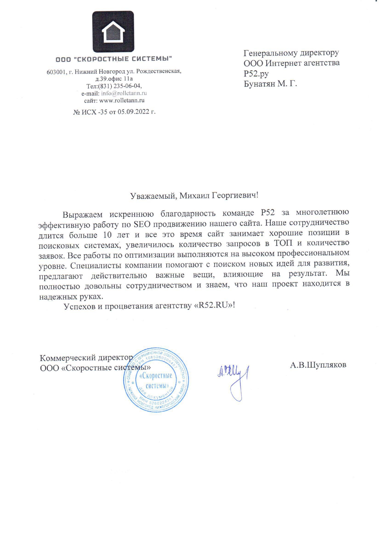 Выражаем искреннюю благодарность команде Р52 за многолетнюю эффективную работу по SEO продвижению нашего сайта. Наше сотрудничество длится больше 10 лет и все это время сайт занимает хорошие позиции в поисковых системах, увеличилось количество запросов в ТОП и количество заявок.