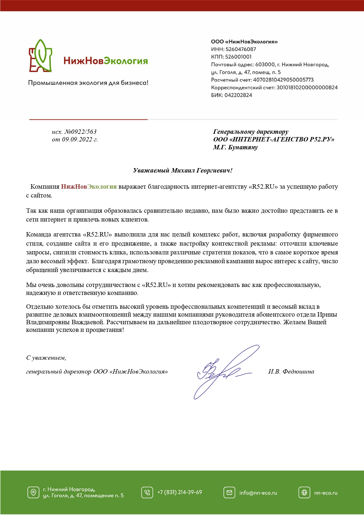 Компания «Нижновэкология» выражает благодарность интернет-агентству «R52.RU» за успешную работу с сайтом.