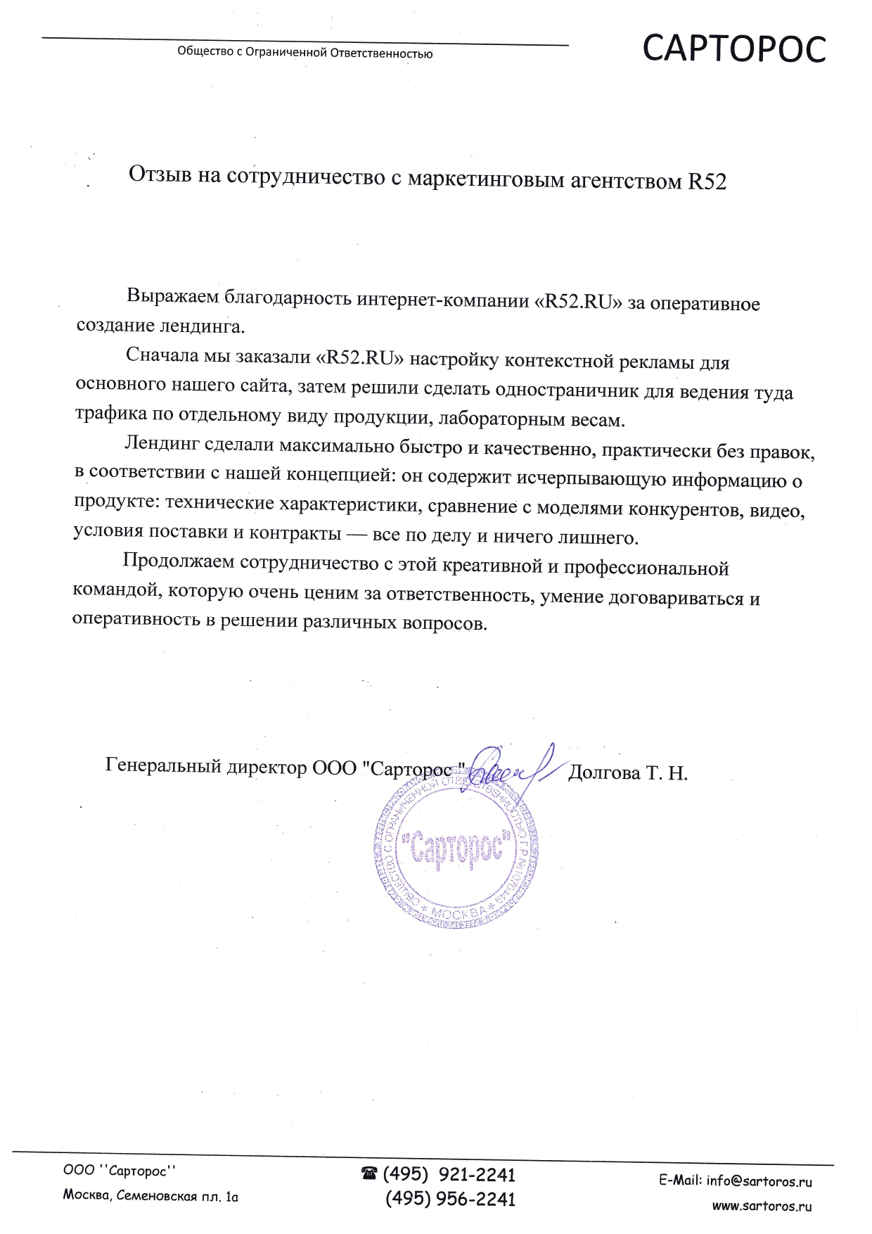 Выражаем благодарность интернет-компании «Р52.РУ» за оперативное создание лендинга.