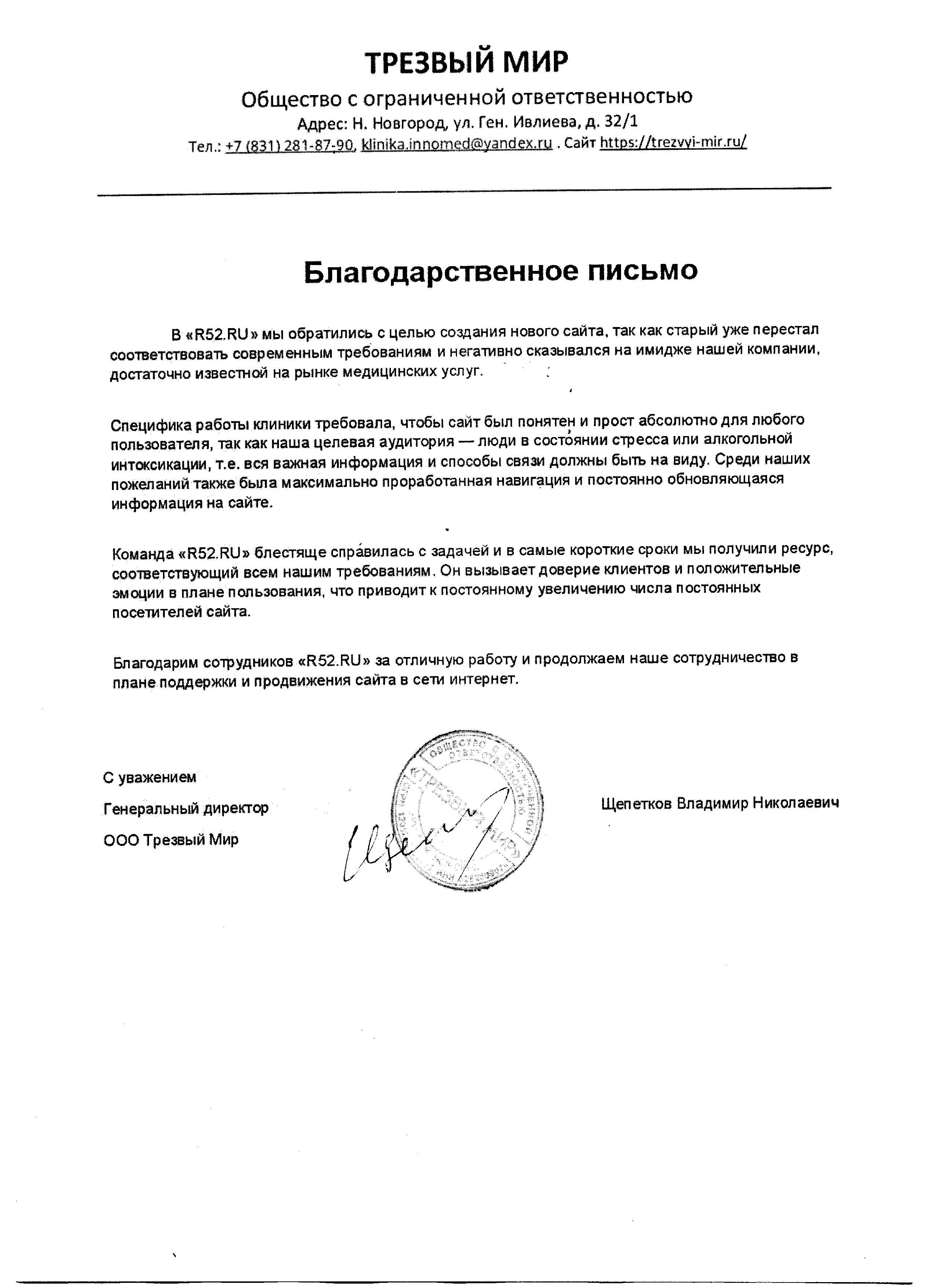 Благодарим сотрудников «Р52.РУ» за отличную работу и продолжаем наше сотрудничество в плане поддержки и продвижения сайта в сети интернет.