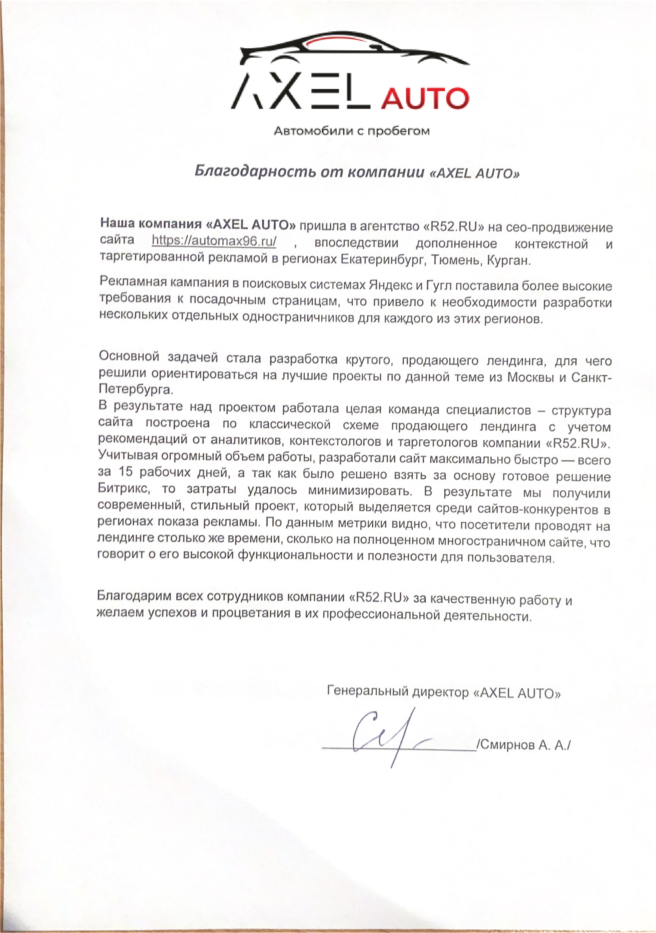 Наша компания «AXEL AUTO» пришла в агентство «Р52.РУ» на СЕО продвижение сайта, впоследствии дополненное контекстной и таргетированной рекламой в регионах Екатеринбург, Тюмень, Курган.